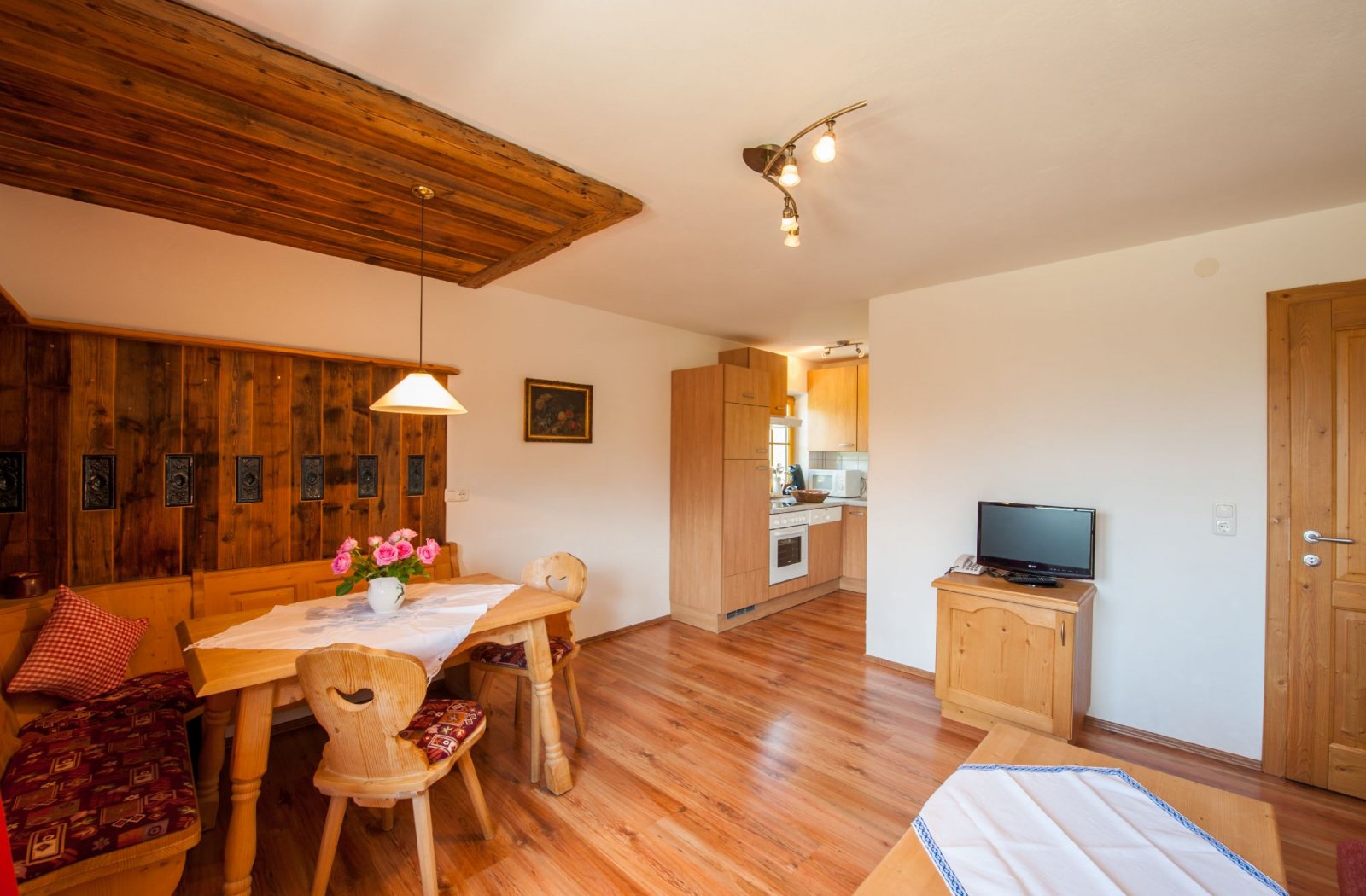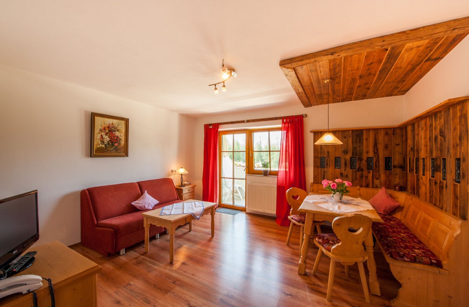 Doppelzimmer, Wohn-Schlafraum, Essecke, Küchenzeile mit 4-Plattenherd, Backrohr, Kühlschrank, Spülmaschine und Mikrowelle, Dusche/WC, Süd-Balkon, Sat-TV, Telefon, Safe.