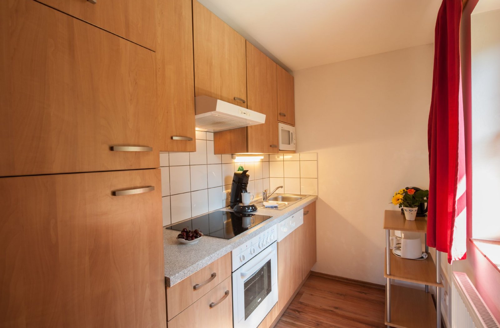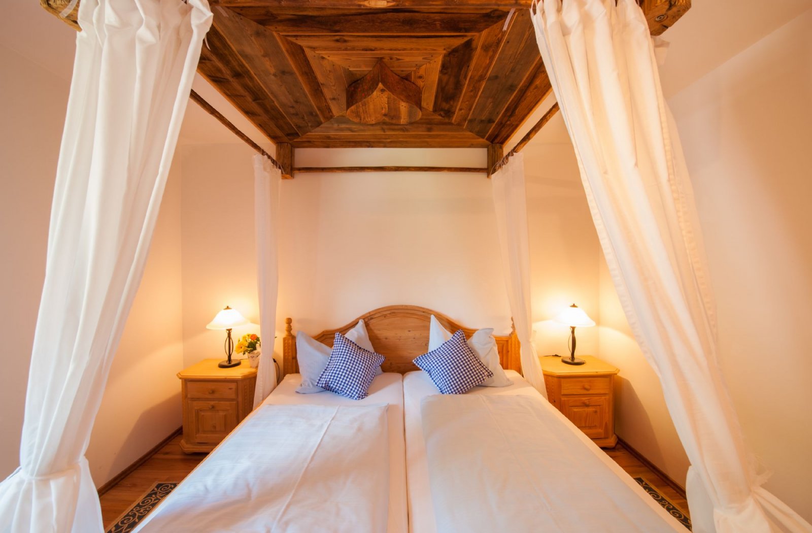 2 Doppelzimmmer (2x mit Himmelbett), Diele, Wohn-Schlafraum, Essecke, Küchenzeile mit 4-Plattenherd, Backrohr, Kühlschrank, Spülmaschine und Mikrowelle, Dusche/WC, Süd-Balkon, Sat-TV, Telefon, Safe.